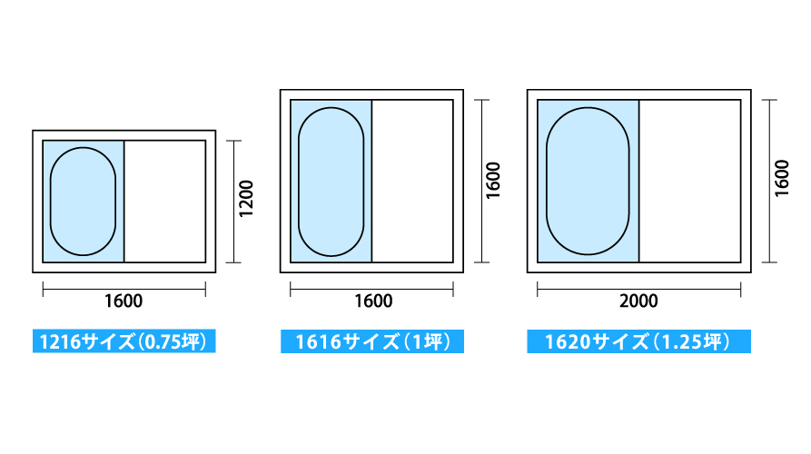 これをベースに、お風呂の空間に合わせて細かくサイズ設定が行われています。幼い子供たちと入浴する家庭の場合は、1616サイズや少し大きめの1620サイズあたりが人気です。