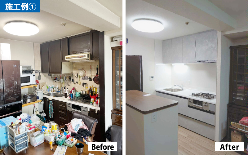 施工例①は、キッチン用家電やゴミ箱などをできる限り隠したいとのご希望でリフォームをされた施工例です。