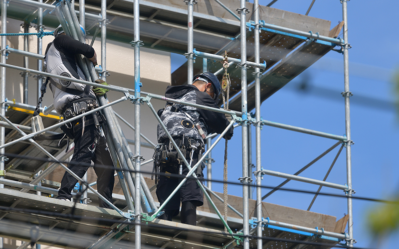 高所作業が多くなりがちな外装工事では、足場の設置から始まることが一般的です。そのあとは、契約内容に沿った外装工事が進められます。