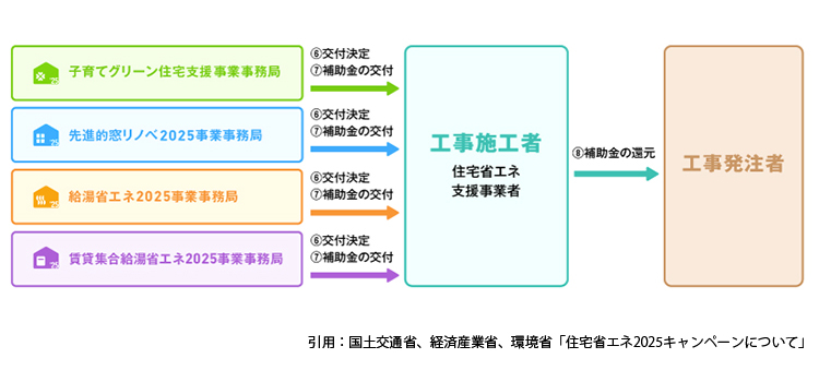 工事施工者から工事の発注者に還元される方法は、工事代金の一部に充当するか、代金支払後に現金で補助金分を返金してもらうかのいずれかです。なお、補助金の交付は、交付決定から1〜2ヵ月後が目安とされています。