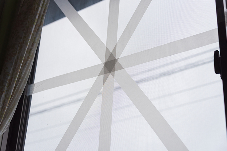 窓ガラスの飛散防止対策として、まず養生テープをマークの形に貼ることが挙げられます。さらに窓枠のまわりにも養生テープを貼っておくことで、割れたガラスが枠内にとどまりやすくなります。