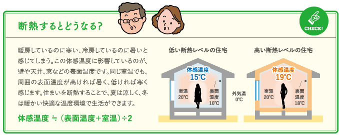 断熱リフォームの目的は心地よい室内環境=体感温度をつくり出すこと。適切な断熱工事を行えば建物の表面温度は外気温に左右されにくくなり、新築住宅と同じく快適な室温を保つことができます。