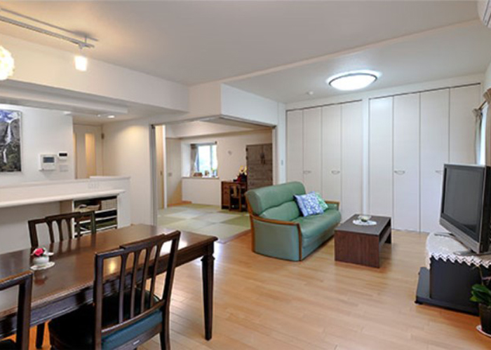 Aさんの事例は、マンションのリフォーム。子どもが巣立ったことで活用されなくなった部屋を含め、空間を見直して広々と暮らすことが目的です。LDKに隣接する和室をなくしてリビングに吸収。逆に和室へと変更した奥の洋間は、襖の開け閉めによって個室化したりLDKの続き間にしたり、自在に使い分けできるようにしています。リフォームのきっかけとなった暗く閉鎖的なキッチンは、囲んでいた壁の一部を撤去することで、視界が開けて家族とのコミュニケーションもスムーズに。広くなったリビング・ダイニングの快適性や窓からの眺めも楽しめるようになりました。
