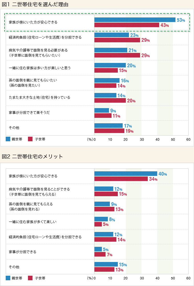 二世帯住宅の実態調査レポート(※1)によると、親世帯にとって子世帯との同居は、「安心感」につながっている様子。老朽化した家のメンテナンスや防犯、日常生活のちょっとしたサポートへの期待が表れています。同じく子世帯にも、「家族がそばにいたほうが安心できる」(図1)という結果が。共働き世帯が増える昨今、子育て(孫育て)への協力が得られることも、同居のメリットとして考えられています(図2)。