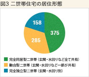 「二世帯住宅の理想は完全独立型」という意見が多数ですが、コストや費用、住宅規模などの条件から、多くの場合、融合型や完全同居型に落ち着くというのが実態です(図3)。