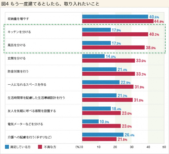 しかし、どのような条件であっても、親子世帯が満足できるリフォームの工夫はあるものです。すでに二世帯住宅に住んでいる人に行った、「もう一度建てる(リフォームする)としたら、取り入れたいこと」というアンケート(図4)を参考にしてみましょう。二世帯住宅を不満に感じている人では、「設備(キッチンや浴室)を分けたい」という項目が上位に。一方、満足している人は、不満の人に比べると、設備を分ける必要をあまり感じていないという結果になりました。両者ともに共通する項目は、「収納量を増やす」でした。