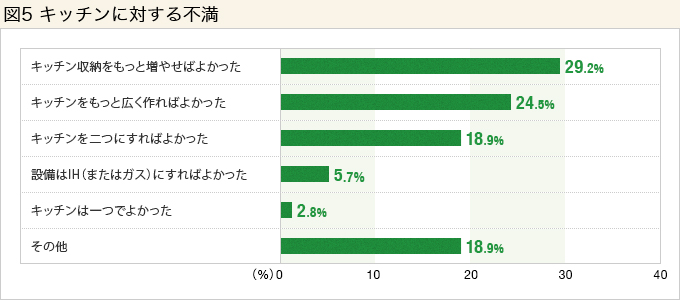 キッチンについても収納量の不足を感じている人が多い様子(図5)。限られたスペースのなかで十分な収納を確保するには、壁面などもフル活用する必要があります。たとえば、大容量の壁面収納を造り付ければ、親子世帯それぞれの好みの食器を収めることも可能。置き型の収納家具に空間を占拠されることもありません。