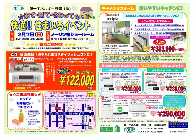 場所:㈱ノーリツ柏ショールーム(住所:柏市十余二297-19)