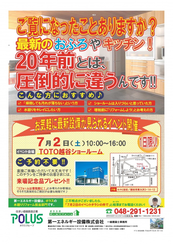 7月2日(土) TOTO越谷ショールームでイベントを開催致します!!