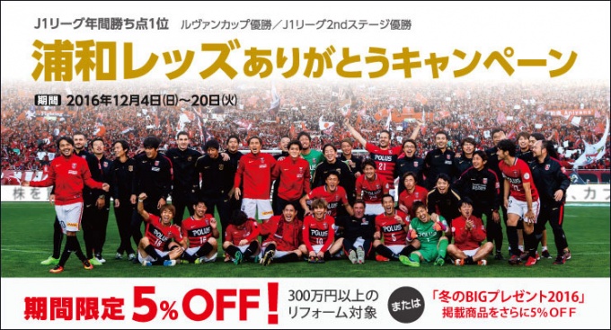 ポラスグループがトップパートナーをつとめる浦和レッズが2016年J1リーグ年間勝ち点1位を獲得するなど、今シーズンの活躍に敬意をはらうとともに皆様への感謝の気持ちをこめて、期間限定でキャンペーンを実施いたします。