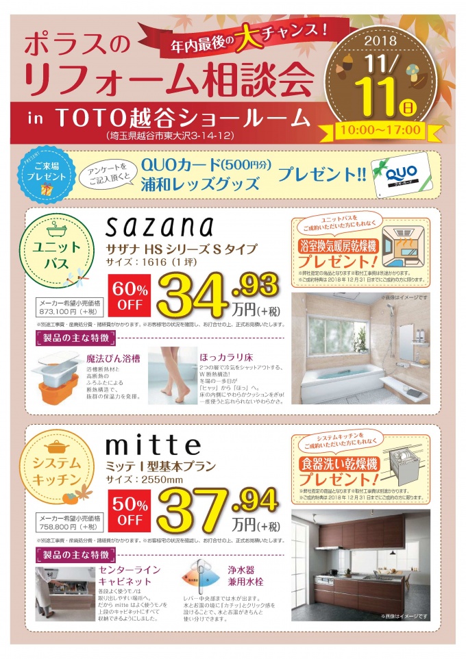 2018年11月11日(日)TOTO越谷ショールームにてリフォーム相談会を開催致します。