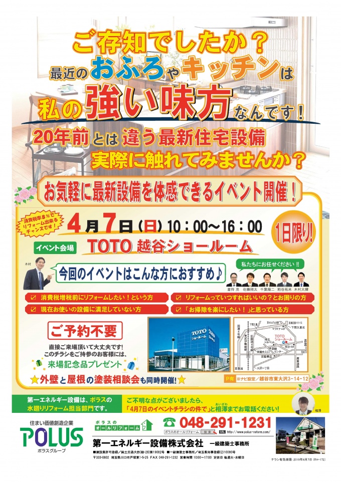 4月7日(日) TOTO越谷ショールームで最新設備が体感できるイベントを開催致します!