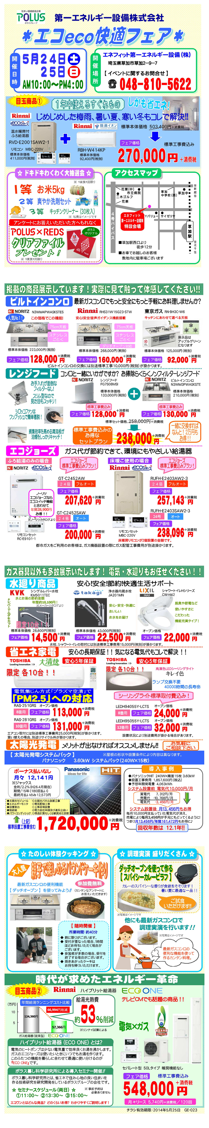 また、今話題のハイブリット給湯器や、ガスコンロ・エコジョーズ・太陽光発電、エアコン、水廻り商品等を多数展示し特別価格にて販売いたします。