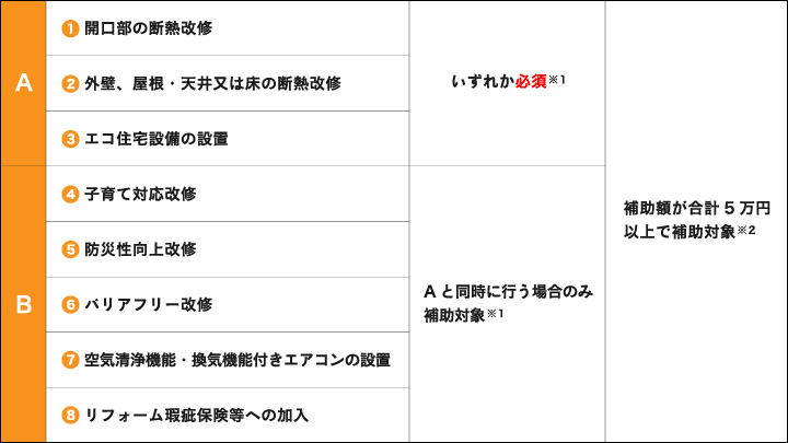 (対象工事内容ごとの補助額は、各リフォーム工事の詳細ページを参照ください)