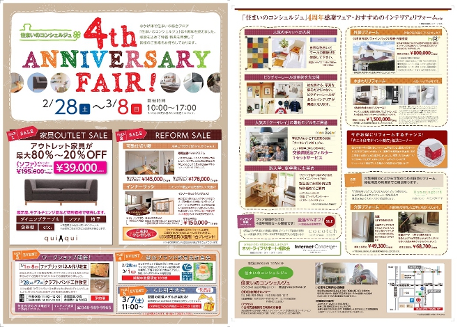 おかげさまで住まいのコンシェルジュはこの3月でオープン4周年を迎えます。そこで日頃のご愛顧に感謝を込めて、「住まいのコンシェルジュ 4周年感謝フェア」を2/28から3/8までの期間で開催致します。お得なインテリア商品、リフォーム商品のセールのほか、ワークショップの開催や、越谷ブランド認定品の「ガーヤちゃんサブレ」の試食会、人気の妖怪メダルが当たるくじ引き大会など楽しいイベントも用意しております。皆さんのご来場をお待ちしております。
