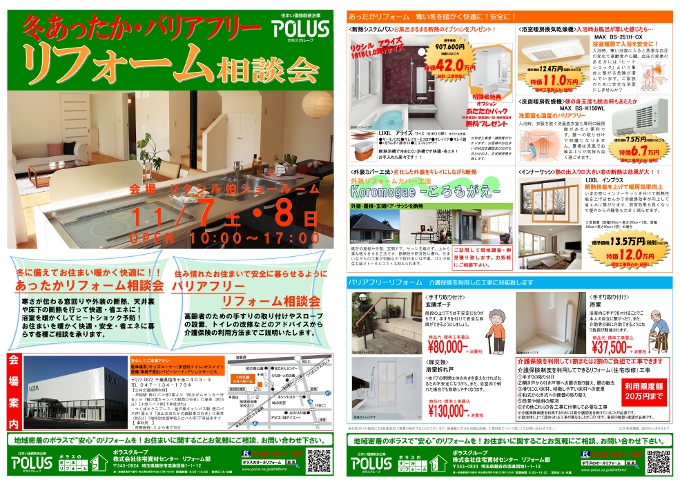 寒い冬、暖かく快適に過ごしたいですよね。そこで今回はお住まいのあったかリフォームのご相談を承ります。窓や外壁の断熱、浴室を暖かくするための設備などをご紹介致します。また、介護のためのバリアフリーリフォーム等ご相談も承ります。介護保険の給付の利用方法なども丁寧にご説明致しますので、お気軽にご相談ください。リフォームを検討していたり、リフォームについて分からないことを聞いてみたいといったご要望がございましたら是非、この機会にご来場ください。