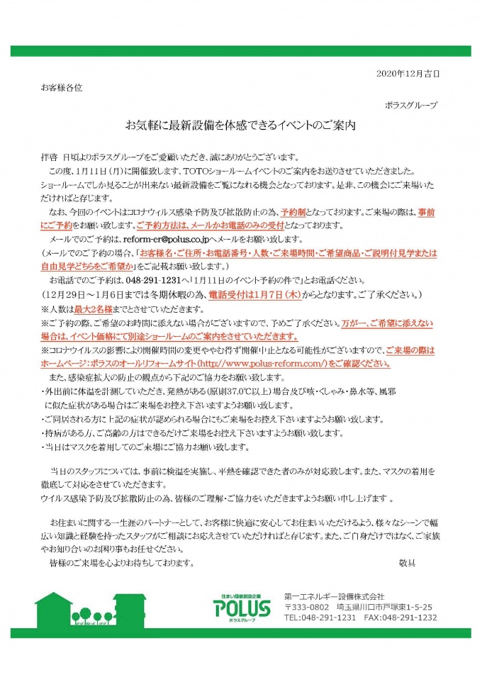 1月11日(月)TOTO松戸ショールームで最新設備を体感できるイベントを開催致します!