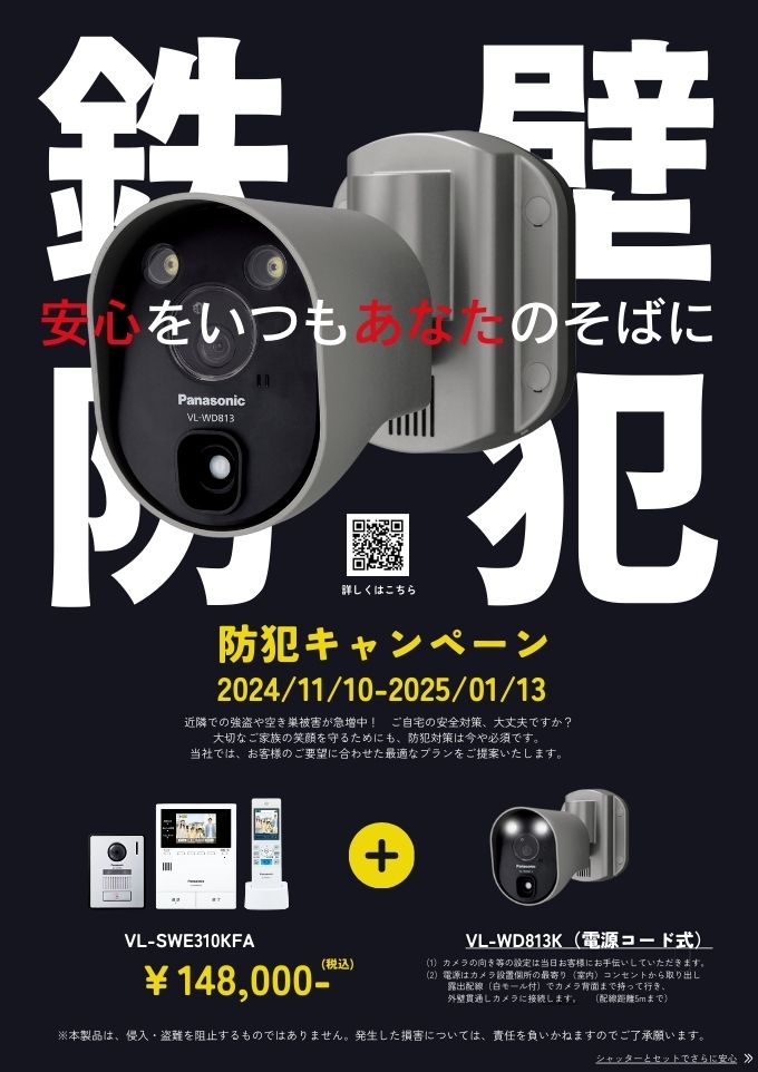 ホームイベント&キャンペーン【防犯キャンペーン】ご自宅の安全対策、大丈夫ですか? 2024.11.12 イベント 【防犯キャンペーン】ご自宅の安全対策、大丈夫ですか? お客様各位 平素はポラスグループ ㈱住宅資材センター リフォーム部をご利用いただき誠にありがとうございます。 今回は「防犯キャンペーン」のお知らせです。 近隣での強盗や空き巣被害が急増中! ご自宅の安全対策、大丈夫ですか?大切なご家族の笑顔を守るためにも、防犯対策は今や必須です。 当社では、お客様のご要望に合わせた最適なプランをご提案いたします☺ お問い合わせはこちら 前の記事へ 一覧に戻る 次の記事へ ポラス施工物件にお住まいの皆様へ ポラス施工物件にお住まいの方で、リフォームのご相談の方は、ご相談予約・お見積依頼フォームからお問い合わせください。 相談予約・お見積り ポラスのお住まいに関する緊急のお問い合わせは、ポラスグループ 住宅品質保証(株)アフターメンテナンス部 048-965-0385 へ直接お電話をお願いします。 イベント&キャンペーン 営業所のご案内 よくある質問