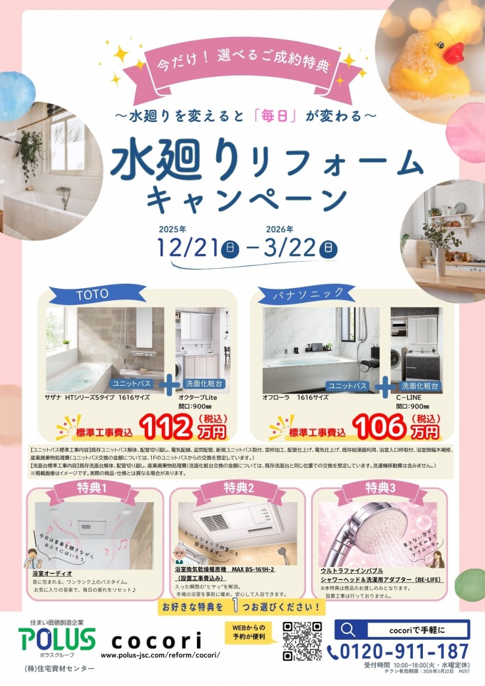 3/22(日)までに対象のお風呂、またはキッチンのリフォームをご成約いただいたお客様限定で、毎日の生活がより豊かになる 「選べるご成約特典」 をプレゼントいたします!