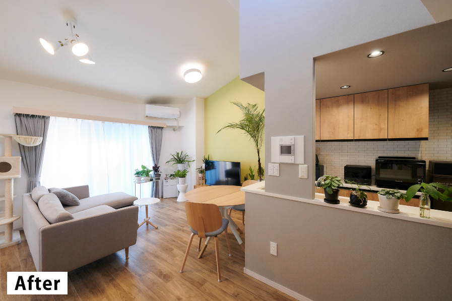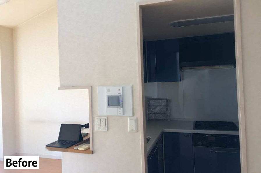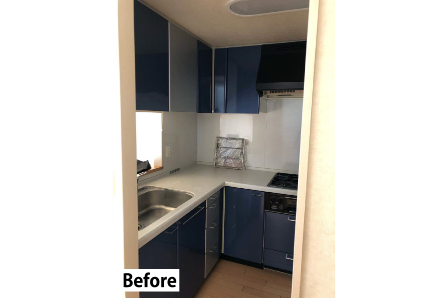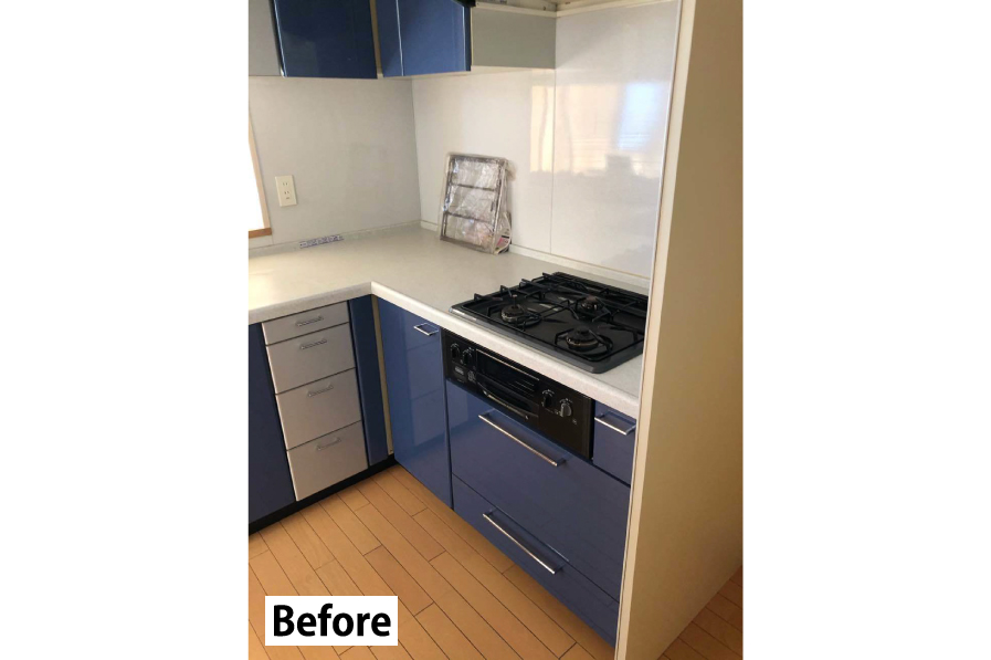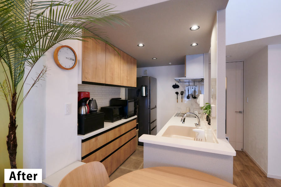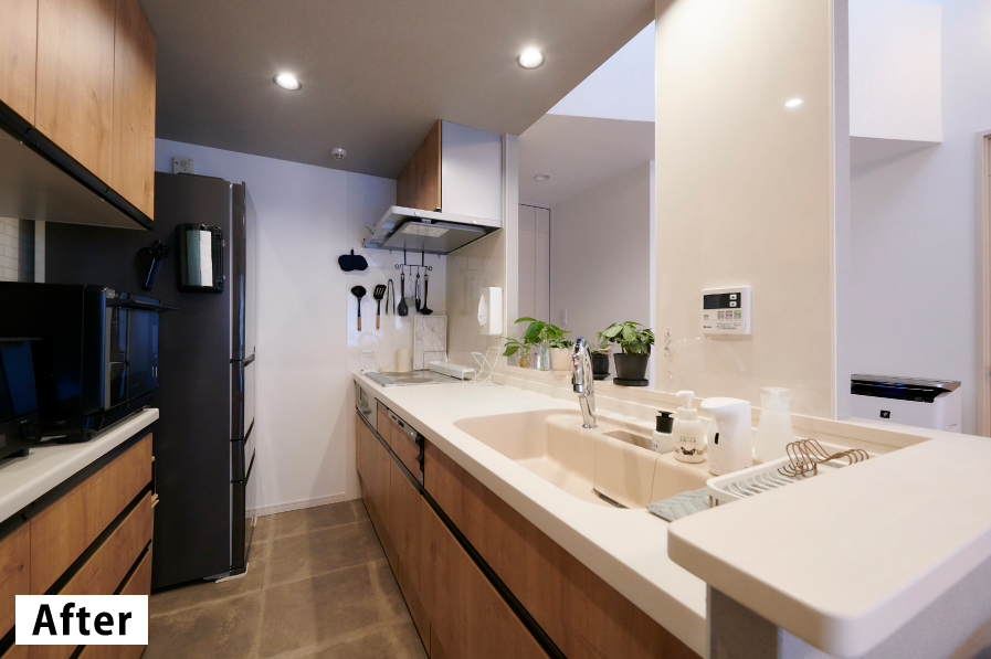 壁に囲まれ壁を向いていたL字型のキッチンをI字型に変更。壁を取り払ったことで視界が広がり、動線もスムーズになりました。食洗機とタッチレス水洗を付けたことで、使い勝手も向上。