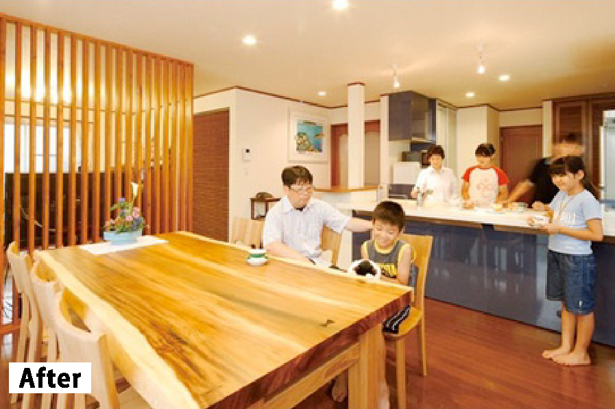 大型キッチンを中心に、開放的なリビングダイニングを実現