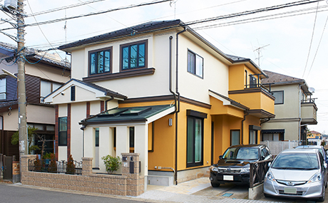 新設したバイクスペースとのバランスを考えながら外装をデザイン。既存の外装デザインを活かしながらクリーム×イエローの2色に色分け塗装。見た目も気分も一新する外観に仕上げました。「来客用に車2台が駐車できるスペースがほしい」という要望にもお答えしています。