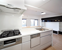 キッチンまわりを大きく変更。システムキッチンは以前使用していた物から約50cmほど作業スペースを広くしたもの採用。そのため廊下へ続く通路が圧迫されない様に隣り合う和室を6畳から4.5畳に変更しています。また廊下のドア位置も合わせて変更し圧迫感が出ないようにしました。