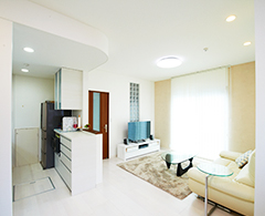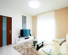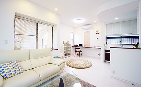 「部屋数がある割には広い空間がないこと」に不満を感じていたお施主様。「広がりのあるLDKの実現」をテーマに白を基調とした透明感と広がりを感じる空間を目指しました。お部屋のポイントとして、キッチン空間との天井部分にアールの下がり壁を設けてお洒落度をプラス。さらにリビングに出窓やガラスブロックを新たに採用することで、広がりと明るさが感じられるデザイン性に富んだ空間に仕上げました。