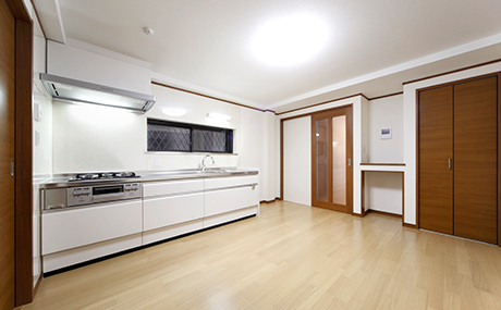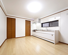 3階建ての戸建て住宅を受け継いだお施主様家族。ライフスタイルに合わせて、階数ごとに目的を分けた間取りにしました。そしてこちらは1階「ダイニング空間」。3つに細かく仕切られていた部屋はゆったりと食事を取るためのスペースとしてリニューアル。また、キッチン・ダイニング空間の奥に「食品庫」を設けたのも収納術のポイントです。