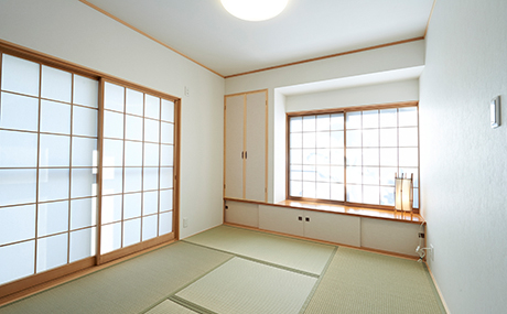 内装のみの和室のシンプルリフォーム。和室の入り口は段差を解消し増築したリビングと一直線に繋がるフラットな床へとバリアフリー済みです。