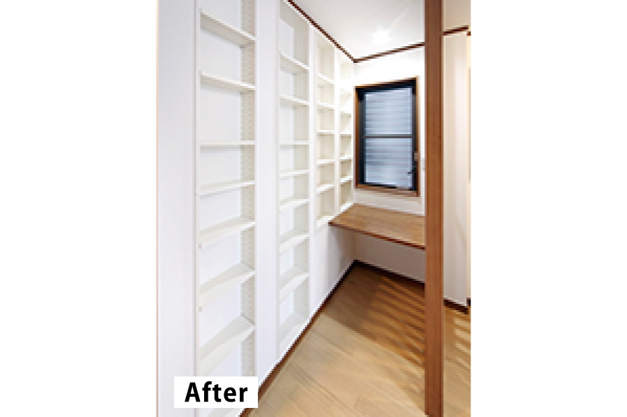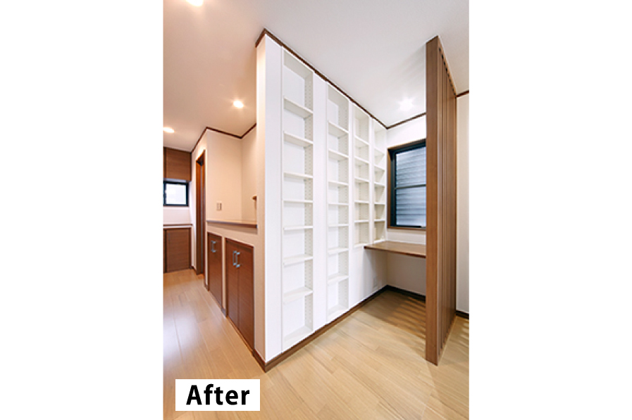 2階へ続く階段を上がると目の前に見えてくるのが、たっぷり本棚の書斎スペース。ご夫婦共に「本が大好き!」との事でしたので天井までいっぱいに造作棚を作りました。また、階段からの視線もほどよく遮れる様に、目隠しのスリッドを設けています。