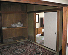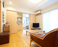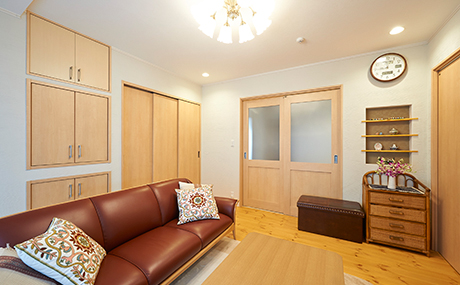 広いリビングをつくるために既存6畳の和室部分を増築し、8畳の洋室に変更。ダイニングキッチンと引戸で繋がりをもたせながら、合計17畳のゆったりしたLDKを実現。さらに床に無垢のフローリング・珪藻土の壁など自然素材の採用で、湿気が気にならない快適空間をご提案。既存和室部分の押入れと、床の間の空間を利用してつくった新たな洋風収納も見所です。