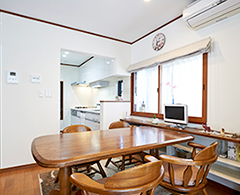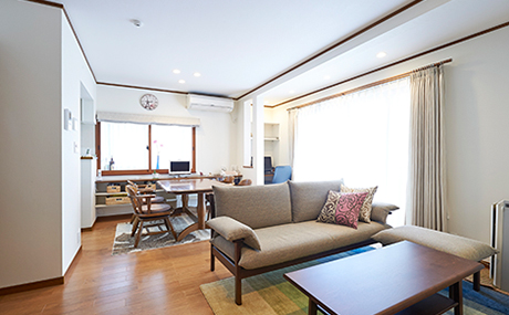 リビングダイニング空間は2間半ほど増築し広さをUP。増築した部分にはPCコーナーを設置して、空間を有効的に活用できるようになりました。また、奥の腰窓側の壁面に新たに設置したカウンターは収納は小物を置くのにとても重宝しているとの事。便利でうれしいリフォームポイントとなりました。