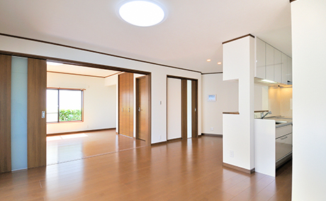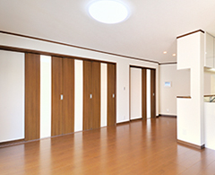 LDKに隣接していた和室は、ガラス窓入りの3本引き戸で空間を仕切れる1つの個室(洋間)へと変更。これは将来的に1階中心の生活になったときにベッドが置ける寝室として使うための老後を視野に入れたプランです。間仕切り扉を全て開ければ、27畳のLDK空間となります。