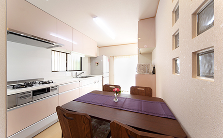 キッチン室とダイニング空間が一緒になった間取り。テーブルの横は玄関ホールとつながる扉があった所。実際には使われていなかったため、塞いでしまいガラスブロックを並べて空間のアクセントにしたのがポイントです。※参考価格にはキッチン設備費は含まれていません。