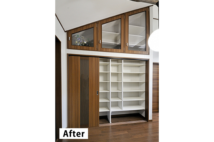 幅1間半(2600mm)と天井勾配まで収納スペースを設けたオリジナル造作収納です。趣味で作られた飾り物を飾るため・仕舞うためのスペースとして提案させて頂きました。設けた場所は、ダイニング脇すぐなので、お客様にも飾ってある作品を見ていただけます。