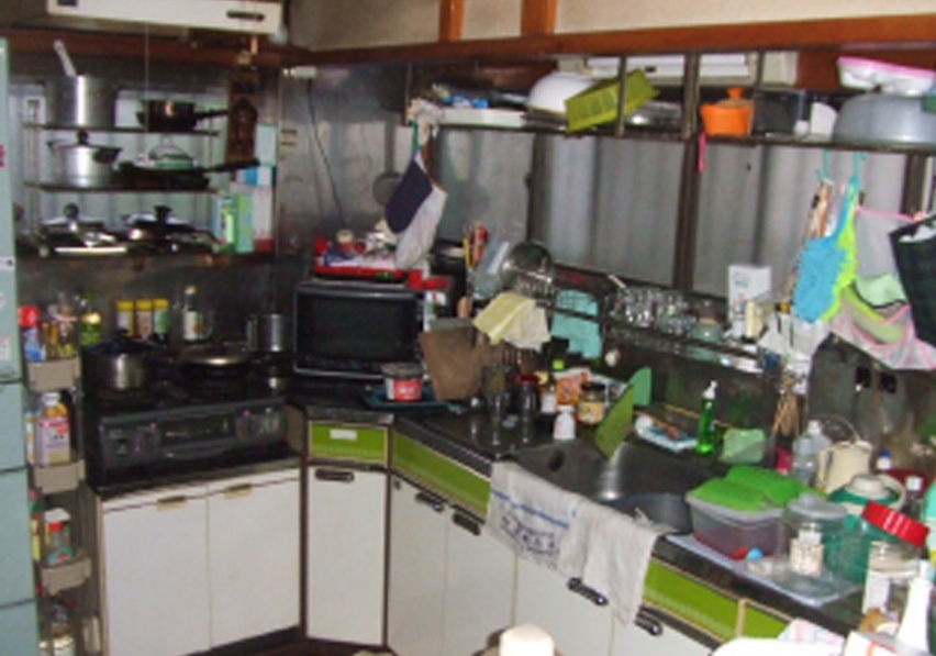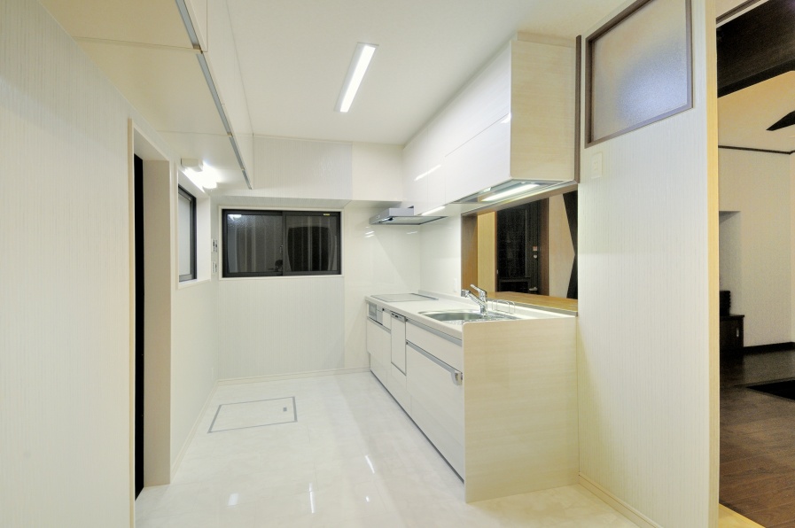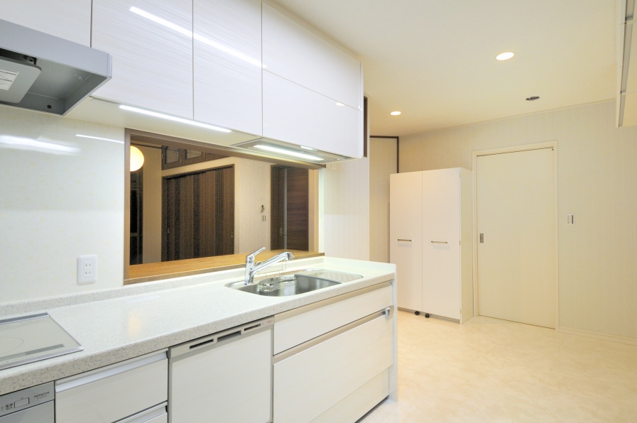 大きく間取りを変えたキッチン空間。料理中にキッチンからLD空間を眺められるようにしました。また、キッチン背面部分には吊戸棚を天井面にくっつける形で1列設けました。持っているキッチン収納と合わせて使うことを想定し、あえてデッドスペースとなる上部にのみ取り付けています。