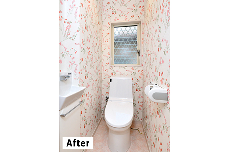 既存トイレの大きさは、一般的なものよりも広く出来ていましたが、玄関ホール側の収納スペースを広く取るために、空間を縮小。空間が少々狭くはなったものの、手洗い器を取り付け、花柄クロスで可愛らしさをプラスしました。