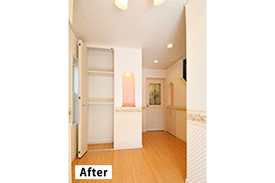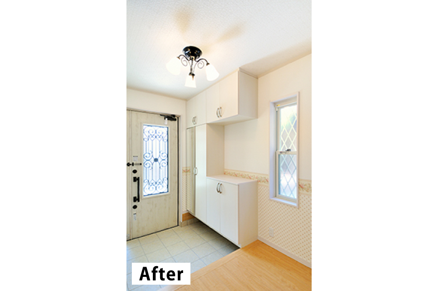 玄関ホールも可愛らしい雰囲気と収納力の強化をポイントに改装しました。玄関に隣接する、広めのトイレ空間を減築し、玄関ホール側に収納スペースを新設しました。また、ピンク色のクロスをあしらったニッチを設けたのもデザインのポイントとなりました。