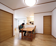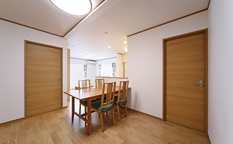 2階お子様世帯のダイニングキッチン。廊下部分を無くし、各部屋にはダイニングを通してアクセスする動線に変更。右側のドアは子ども部屋へ続き、左側のドアはご夫婦の寝室へ。どちらも今回のリフォームで新たに設置した空間です。「あえて子ども部屋を小さくすることで、自然と子どもがダイニングに集まってくるようにしてもらいました」とお施主様。対面式キッチンなので、ダイニングテーブルでお子様の勉強を見てあげることもできますね。※当参考価格はキッチン部分のリフォーム費用を含む。