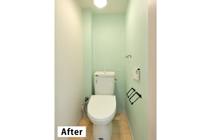 柔らかなパステルカラーのトイレは、なんだか優しい気持ちになれる空間に。トイレットペーパーフォルダもアイアン調のものを使い、細部にわたりS様のお好みのテイストを追及しました。