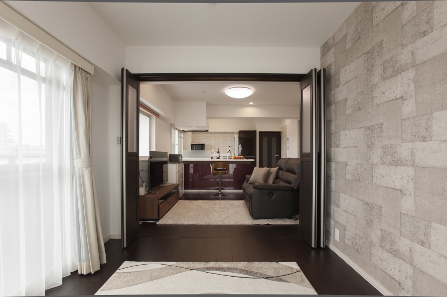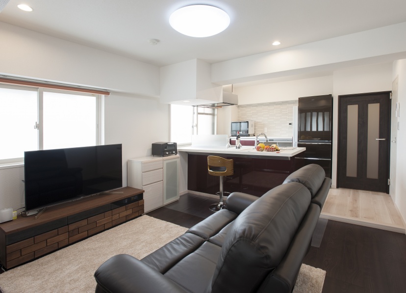 北側の個室と廊下部分も取り込んで、ワンルームの広いLDKが実現。カウンター付の対面キッチンがスタイリッシュなリビングの主役に。