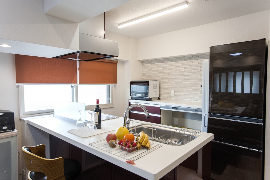 壁を向いていたキッチンは対面タイプのシステムキッチンに変えたので、広いリビングや洋室との連続感や開放感を味わえます。