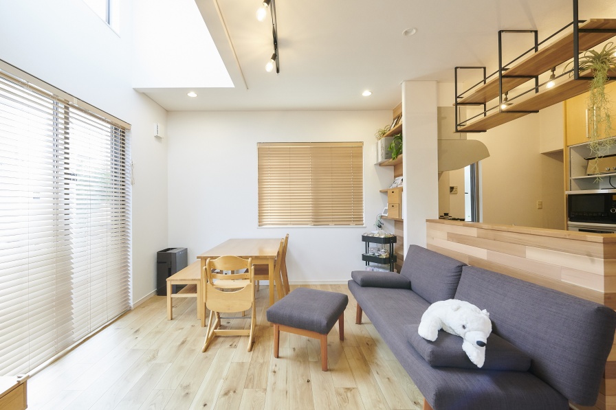 リビング全体を明るくナチュラルに計画。フローリングを木の本来の性質に張替えたことで足触りもよく、吹き抜けには温かい空気を循環させるためにシローリングファンを取付けました。
