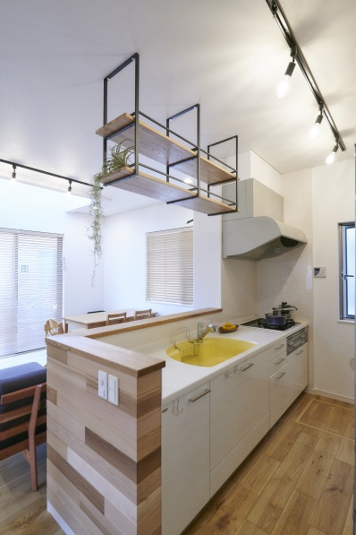 無垢の棚板とアイアン(鉄製フレーム)を使った見せる収納として吊り棚を取付けました。