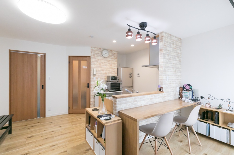 壁に向いていたキッチンを90度回転。バルコニーに向けることで明るさを確保しました。また、スペースを広く使うため、ダイニングテーブルは置かずに、キッチンカウンターを取り付けています。