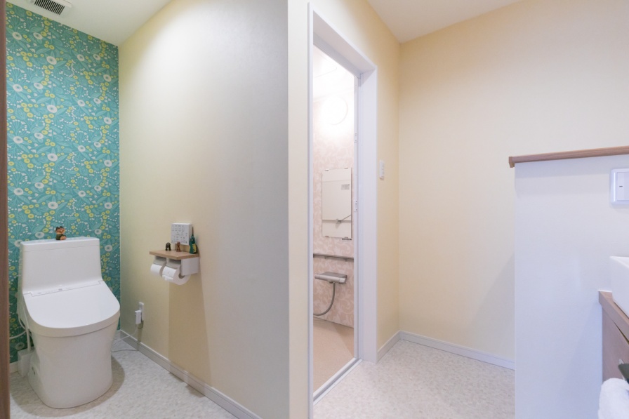 トイレと洗面所をつなげて開放感がある設計。海外のホテルのような動線に変更しています。
