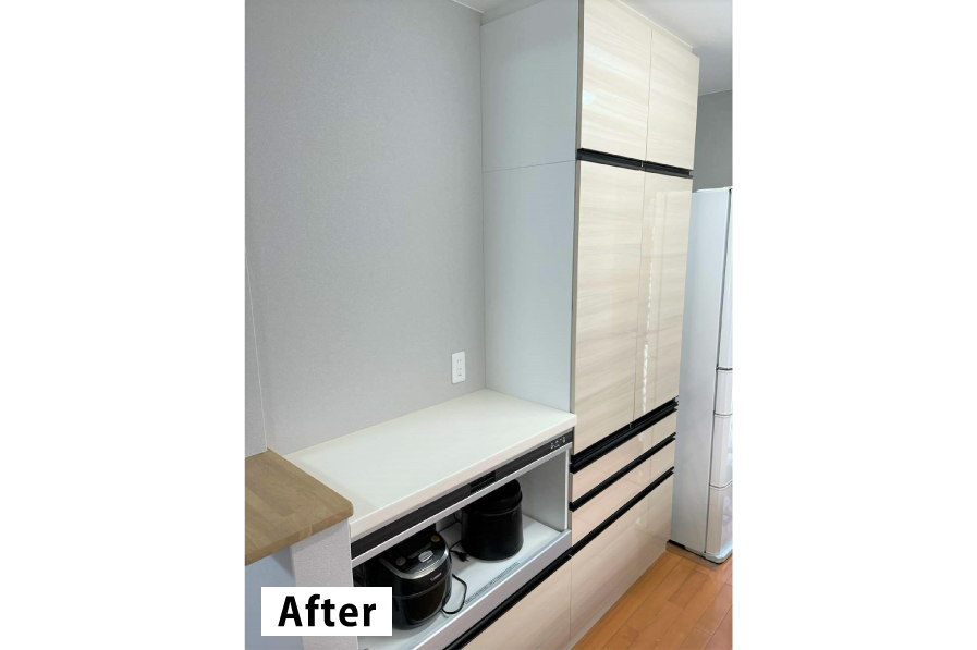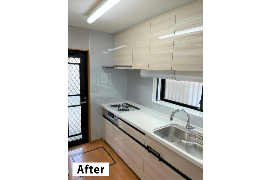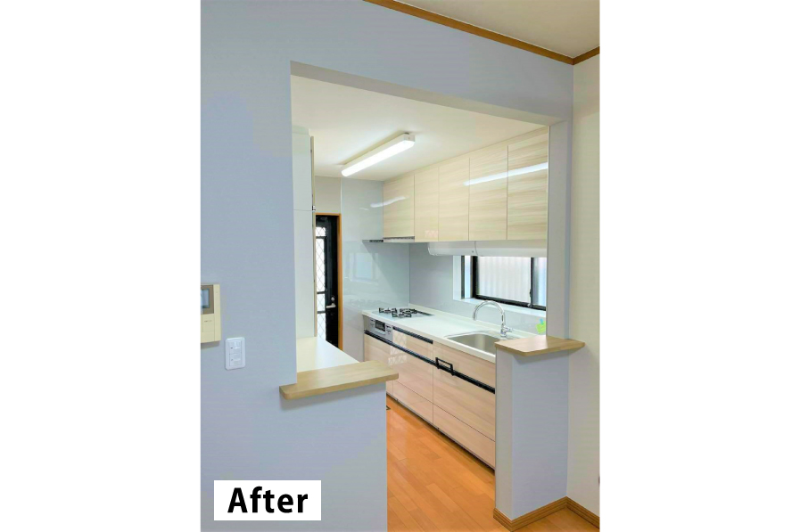以前のキッチンは壁に囲われていており独立したキッチンとなっておりました。キッチン開口部の両脇の壁を一部解体しリビングとの一体感を持たせ明るいキッチンへと生まれ変わりました。