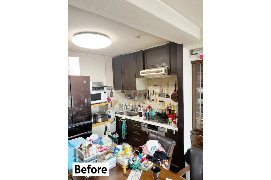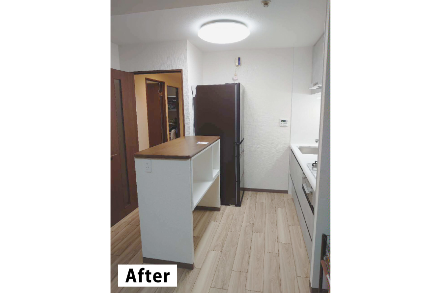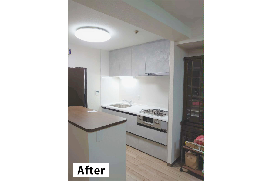キッチン用家電やゴミ箱や小物などはできる限り隠したい。というのがお施主様のご希望でした。新たにカウンターを造作して家電や小物類をスッキリと収納可能なキッチンになりました。