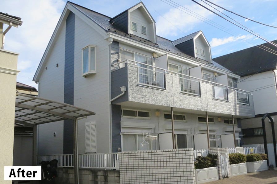 経年劣化で錆や汚れなどが発生していた部分はしっかりと修繕し、外壁を2色で塗分けしたことでメリハリのあるお洒落でモダンなアパートに生まれ変わりました。